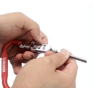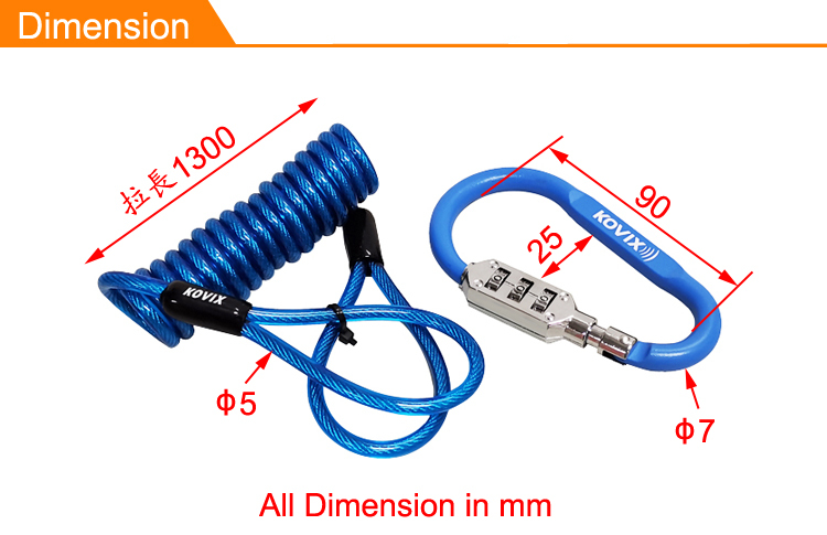 KHEL100 three-digit code design helmet lock. Cast with aluminum alloy material, surface spray PVC. It is equipped with a steel wire rope covered with PVC, and the overall extension length is 1.3 meters. Lightweight, safe and won't scratch your helmet or car.
