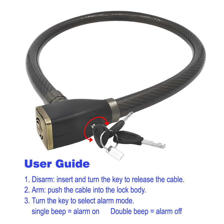 The cable-lock alarm with built-in vibration and movement sensing system. In alarm mode, any impact or movement will trigger the 120dB piercing alarm function. Can be used for motorcycles, bicycles, shops or home doors and Windows.